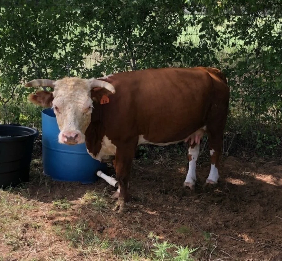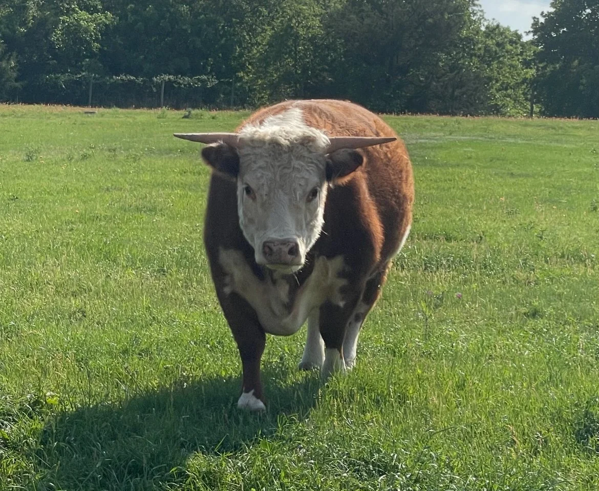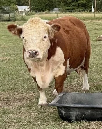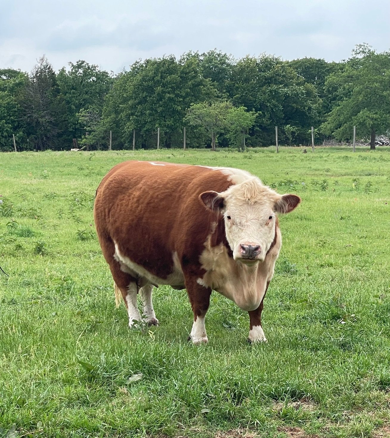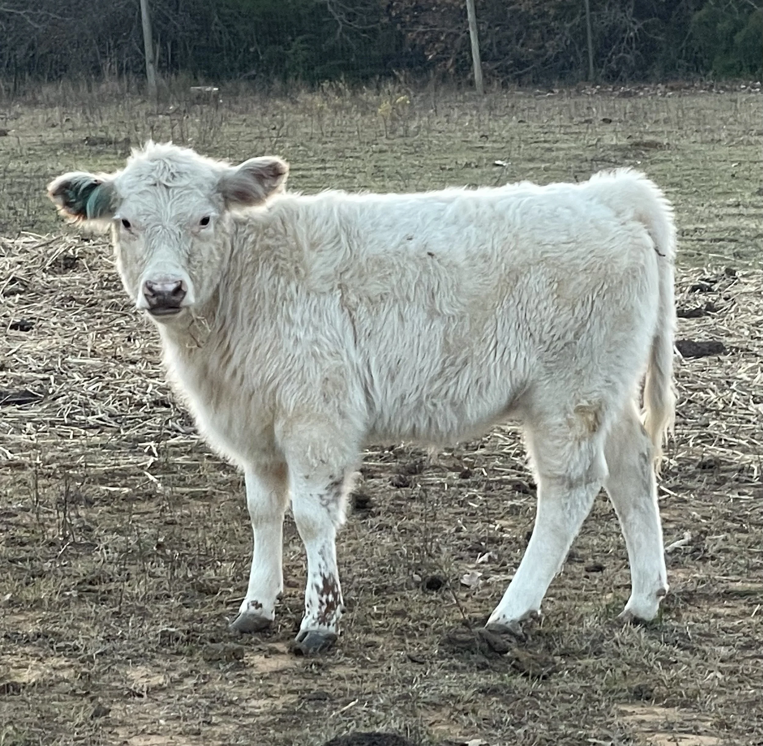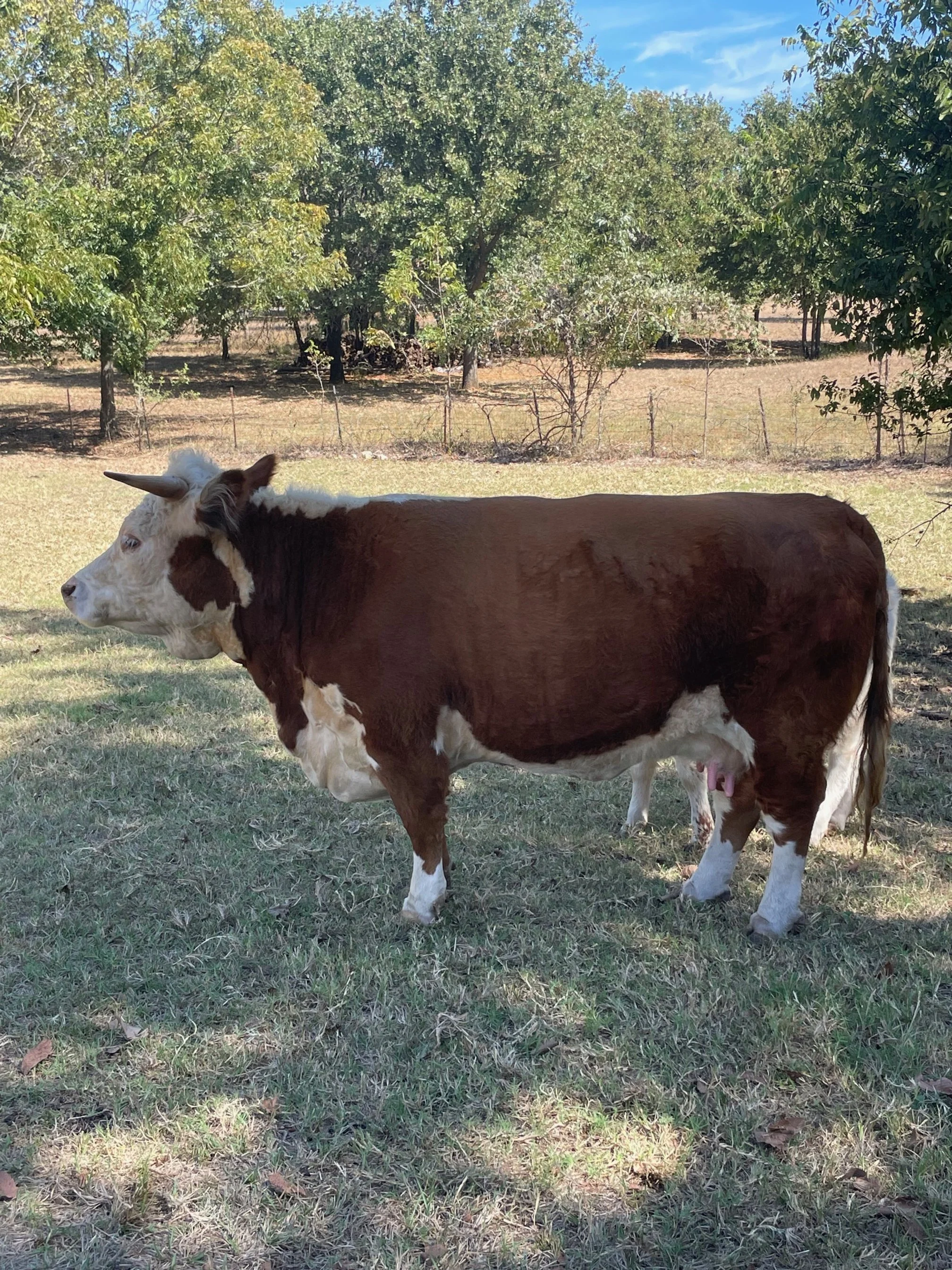 Emmy Lou is 11yrs old & about as stout as they come!  She is 45" inches tall with a straight & wide top line, has a broad chest & powerful hindquarter.  She will come up for treats but gives you space when you need it.  She calves easily & unassisted every time. She has had 5 calves so far, 3 girls & 2 boys, and is currently due in the spring of 2026!