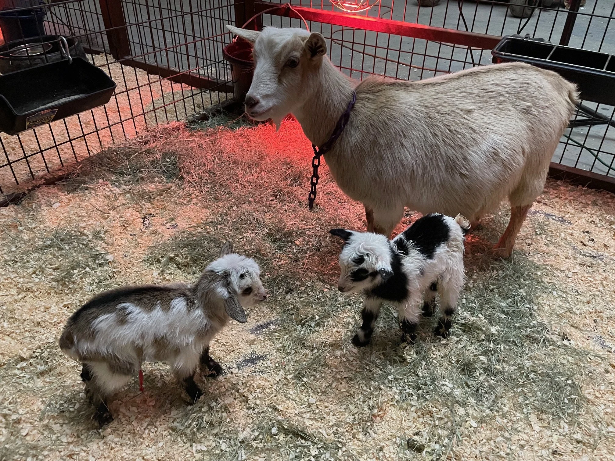 The doe/does get their own stall in the barn and an attached outdoor run.